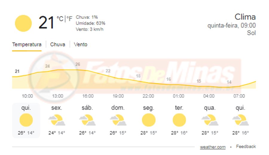 Céu parcialmente nublado com névoa úmida ou nevoeiro ao amanhecer no Jequitinhonha, Mucuri e Rio Doce. Demais regiões, céu claro a parcialmente nublado com névoa seca. Névoa úmida ao amanhecer no Campo das Vertentes, Zona da Mata e Sul/Sudoeste.