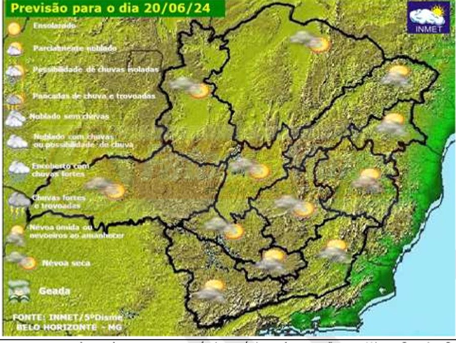 MINAS GERAIS – Nesta quinta-feira, dia 20 de junho de 2024, o outono se despede com características típicas da estação em Minas Gerais. O dia amanhece com névoa úmida ou nevoeiro na faixa leste e no sul do estado. Nas demais regiões mineiras, o dia será com predomínio de sol, grande variação das temperaturas e baixos índices de umidade à tarde. O inverno 2024 inicia às 17h51, no horário de Brasília/DF, maiores informações sobre a nova estação no final do arquivo.