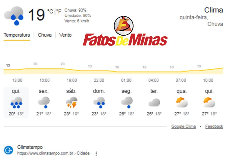 Céu encoberto com pancadas de chuva no Noroeste, Norte, Jequitinhonha, Rio Doce, Mucuri, Zona da Mata, Metropolitana e Central Mineira. Céu nublado com pancadas de chuva e trovoadas isoladas no Triângulo Mineiro/Alto Paranaíba. Demais regiões, céu nublado com chuva.