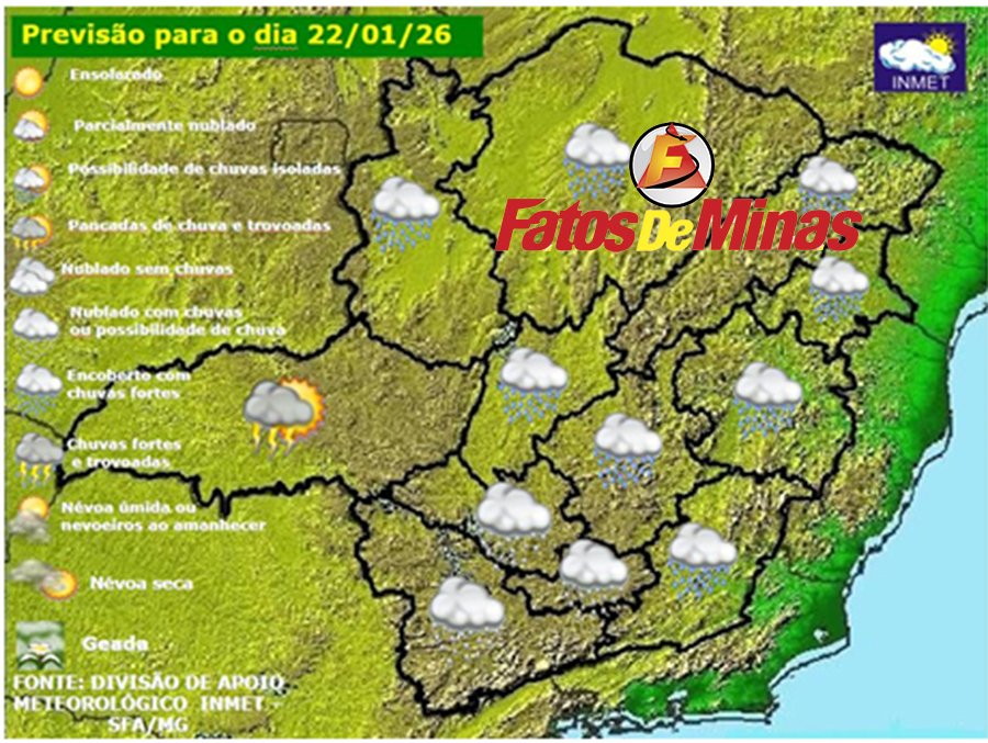 MINAS GERAIS – Nesta quinta-feira, dia 22 de janeiro de 2026, as condições de tempo permanecem inalteradas em Minas Gerais, ou seja, céu encoberto com chuva a qualquer hora em quase todo o estado, devido a atuação da ZCAS (Zona de Convergência do Atlântico Sul). Momentos de mormaço ou abertura de sol restritos ao Triângulo Mineiro. Há previsão para grandes acumulados de chuva na área central do estado, compreendendo a Central Mineira, Região Metropolitana e Belo Horizonte, parte do Rio Doce e da Zona da Mata, no decorrer do dia.