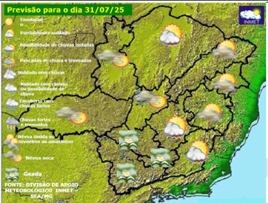 MINAS GERAIS – Nesta quinta-feira, dia 31 de julho de 2025, as condições meteorológicas são favoráveis ao tempo estável com predomínio de Sol e temperatura baixa em todas as regiões do estado de Minas Gerais, por causa da atuação de uma grande massa de ar frio polar. Há condições para formação de geada no Sul/Sudoeste, Oeste e Campo da Vertentes. Baixa umidade do ar à tarde no Triângulo Mineiro e Noroeste do estado. A condição para baixas temperaturas e formação de geada deve persistir até o próximo sábado (02/08/2025) no sul de MG. O frio seguirá intenso em BH e RMBH nos próximos dias.