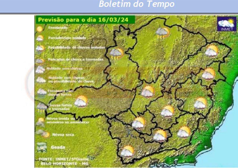 MINAS GERAIS – Fim de semana com temperaturas elevadas em Minas Gerais. O sábado será de tempo aberto e calor no centro-sul e oeste do estado, devido a atuação da onda de calor. Por outro lado, chuvas isoladas podem ocorrer no Norte e Noroeste mineiro, devido ao ciclo diurno de temperatura e umidade. No domingo, temperaturas elevadas são esperadas também no Norte e Noroeste do estado. Entretanto, a tendência é que a partir de segunda-feira, as pancadas de chuva retornem amenizando o calorão em Minas Gerais.