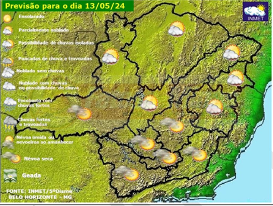 MINAS GERAIS – Segunda-feira, dia 13 de maio de 2024, de tempo estável e temperaturas elevadas em Minas Gerais. O deslocamento de uma frente fria pelo oceano em direção as imediações do litoral da Região Sudeste, intensifica o transporte de ar quente e seco da Região Centro-Oeste para a Região Sudeste, o que tende a manter as temperaturas elevadas em todo o estado. A frente fria não afetará o estado, no entanto, a massa de ar frio que avançará na retaguarda do sistema, romperá a onda de calor a partir da próxima quarta-feira.