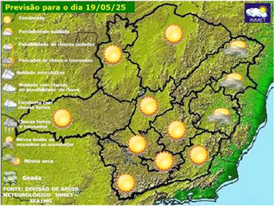 MINAS GERAIS – Nesta segunda-feira, dia 19 de maio de 2025, o efeito dos ventos marítimos deixa o céu com maior nebulosidade nos Vales do Jequitinhonha, Rio Doce e Mucuri. Nas outras regiões do estado, o ar frio e seco mantém o tempo estável com predomínio de céu claro a parcialmente nublado. As temperaturas devem sofrer mudanças significativas ao longo da semana em Minas Gerais. Não há previsão de chuva no estado nos próximos dias.