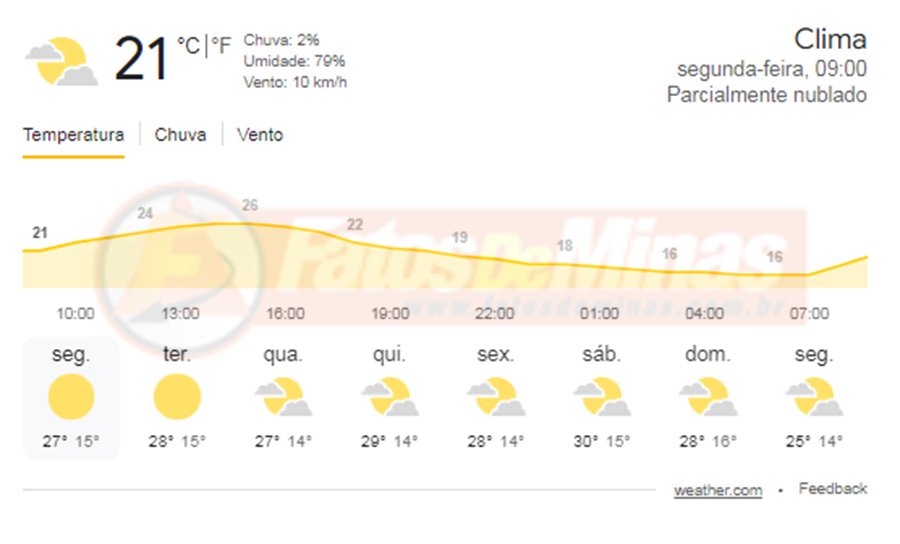 Céu parcialmente nublado com chuvisco ou chuva fraca no Jequitinhonha. Céu parcialmente nublado com névoa úmida ao amanhecer no Mucuri, Rio Doce e Zona da Mata. Céu parcialmente nublado a claro no Noroeste, Norte e Central Mineira. Demais regiões, céu claro a parcialmente nublado com névoa seca.