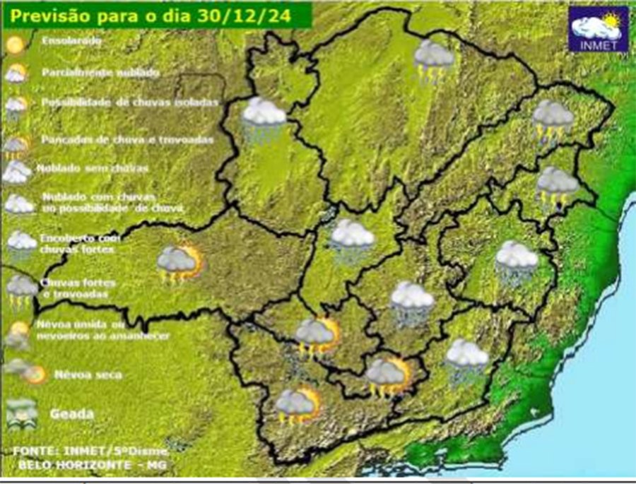 MINAS GERAIS – Segunda-feira, dia 30 de dezembro de 2024, de tempo instável em todo o estado de Minas Gerais, devido à atuação da Zona de Convergência do Atlântico Sul que estabelece um canal de umidade entre a Amazônia e as regiões Centro-Oeste e Sudeste do país. As temperaturas não devem sofrer mudanças significativas no estado e a máxima prevista é de 32ºC no Norte mineiro.