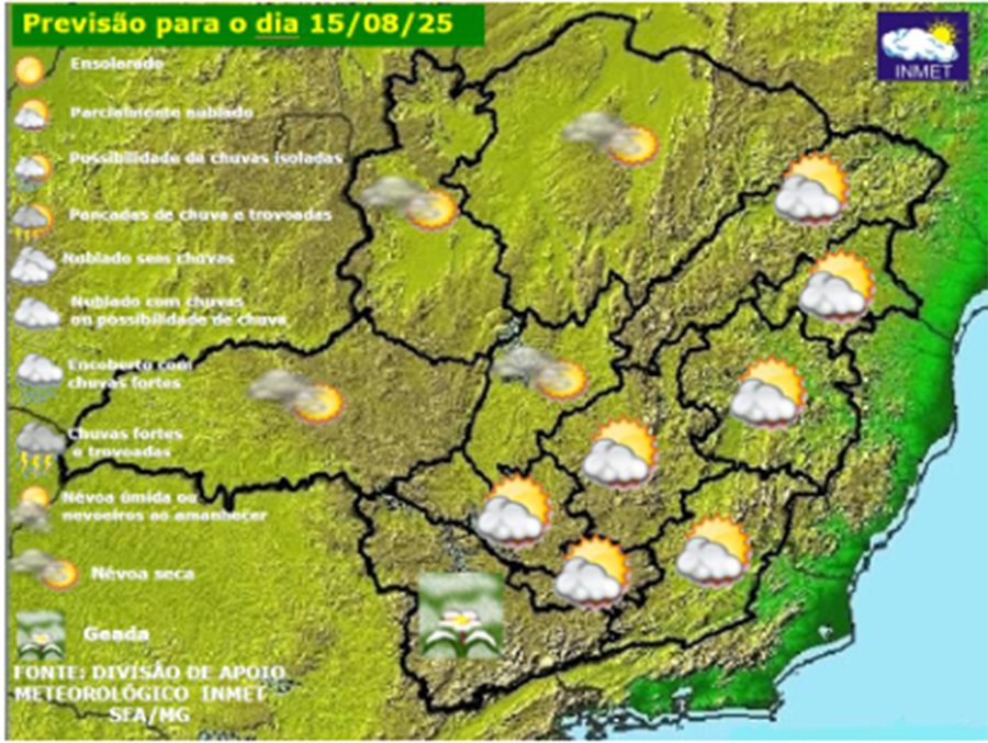 MINAS GERAIS – Sexta-feira, dia 15 de agosto de 2025, e sábado (16) com mais nebulosidade na faixa leste do estado, devido ao aporte de umidade ocasionado pela passagem de uma frente fria oceânica e pela alta pressão pós frontal, essa condição pode até ocasionar chuvas fracas e isoladas nessas regiões. Nas demais regiões do estado, o tempo seco prevalece com índices críticos de umidade em grande parte do estado. Ao longo do sábado e domingo volta a predominar o tempo seco em todo o estado.