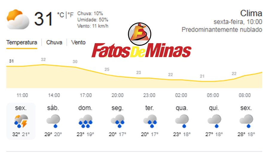 Céu parcialmente nublado com pancadas de chuva e trovoadas isoladas no Triângulo Mineiro/alto Paranaíba, Oeste, Sul/Sudoeste, Campo das Vertentes e Zona da Mata. Demais regiões, céu parcialmente nublado com possibilidade de chuva isolada.