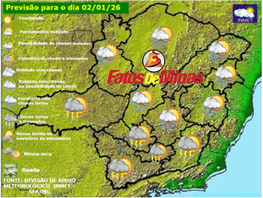 MINAS GERAIS – Sexta-feira, dia 2 de janeiro de 2026, com temperaturas elevadas e temporais em Minas Gerais. A aproximação de uma frente fria para o litoral da Região Sudeste mantém as temperaturas elevadas em todo o estado, situação pré-frontal. A combinação entre aquecimento diurno e disponibilidade de umidade favorece a ocorrência de temporais principalmente no Triângulo Mineiro, Oeste, Sul e Zona da Mata. Entretanto, não se pode descartar a possibilidade das típicas pancadas de verão no restante do estado.