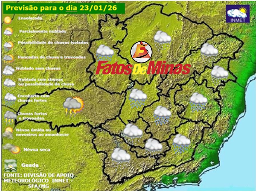 MINAS GERAIS – Sexta-feira, dia 23 de janeiro de 2026, será mais um dia de muita chuva em Minas Gerais. A ZCAS (Zona de Convergência do Atlântico Sul) continua atuando sobre o estado, mantendo o tempo encoberto, com chuva a qualquer hora, na maioria das regiões mineiras. Persiste a expectativa de grande acumulado de chuva na área central do estado, devido à grande convergência de umidade para este setor mineiro. Por isto, a necessidade de se manter atento as orientações da Defesa Civil.