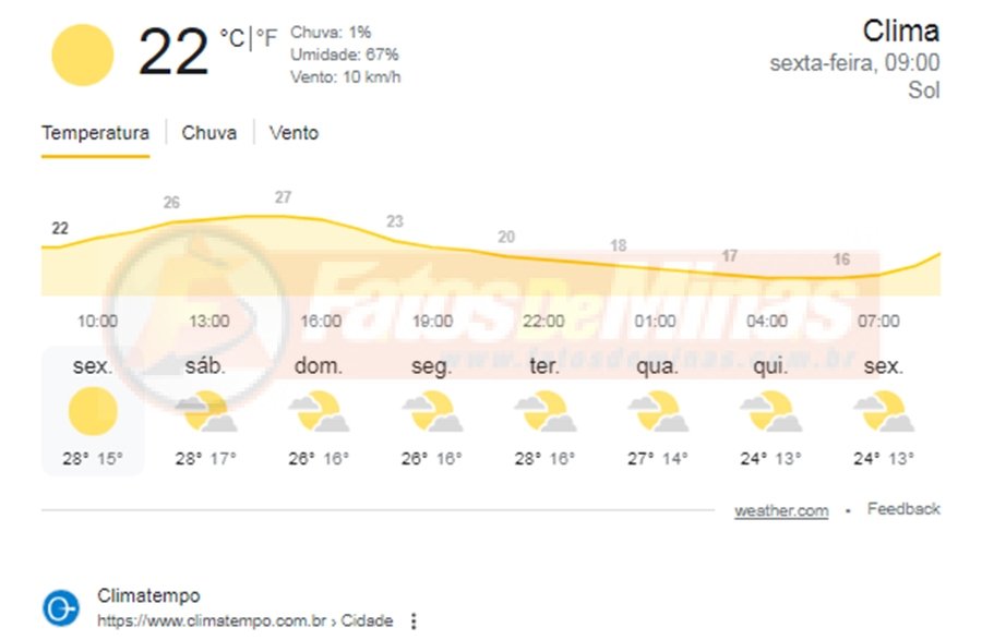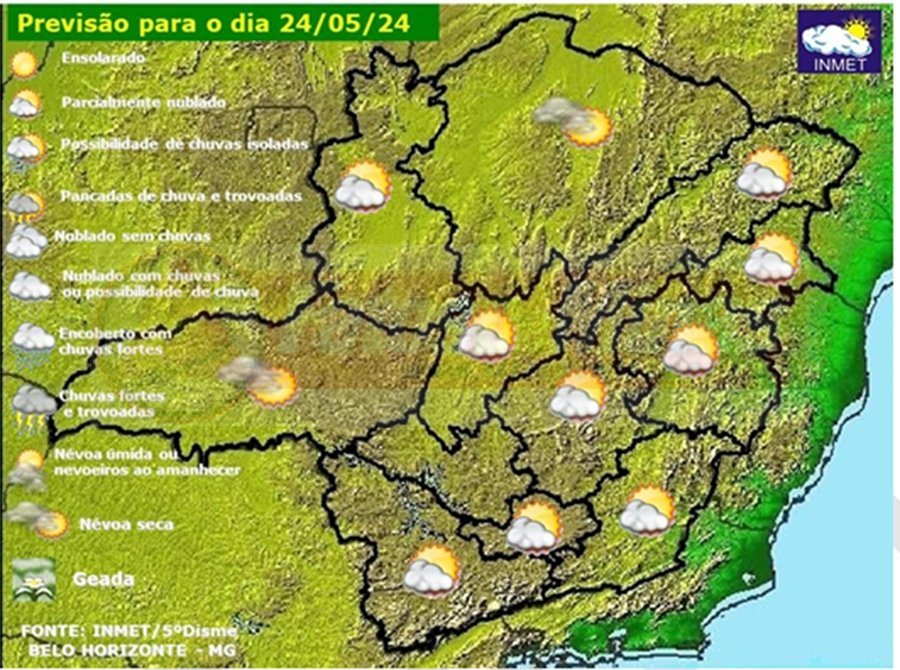 MINAS GERAIS – Sexta-feira, dia 24 de maio de 2024, segue com características mais parecidas com o outono em Minas Gerais. O céu claro à noite, sem nuvens, favorece para grande perda radiativa e consequentemente temperaturas mais amenas pela manhã. O avanço de uma frente fria em direção à Região Sudeste, favorece para que as temperaturas máximas se elevem, principalmente no sul e oeste mineiro. Índices de umidade inferiores a 30% são esperados para o Triângulo Mineiro e Norte.