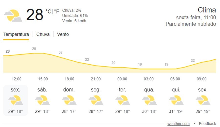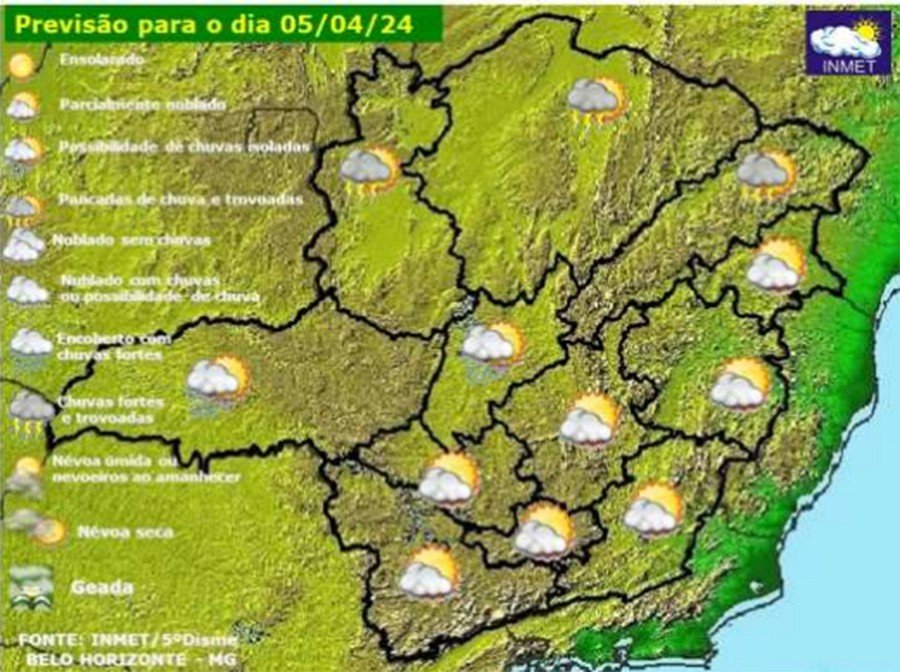 Céu parcialmente nublado com pancadas de chuva e trovoadas isoladas no Noroeste, Norte e Jequitinhonha. Céu parcialmente nublado com possibilidade de chuva isolada no Triângulo Mineiro/Alto Paranaíba e Central Mineira. Demais regiões, céu claro a parcialmente nublado. 13/15 Estável 33/35 Estável Leste Nordeste Sudeste Fraco/ Moderado.