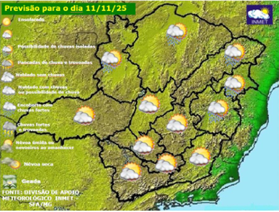 MINAS GERAIS – Terça-feira, dia 11 de novembro de 2025, de sol entre nuvens em Minas Gerais. O transporte de umidade do oceano para o continente, mantém o dia com muitas nuvens e condições para chuvas fracas e isoladas no Jequitinhonha e leste mineiro. No Noroeste e Norte, chuvas isoladas ainda podem ocorrer, principalmente na divisa com a Bahia, mas a tendência é de redução das nuvens ao longo do dia. No restante do estado, apenas variação de nebulosidade.
