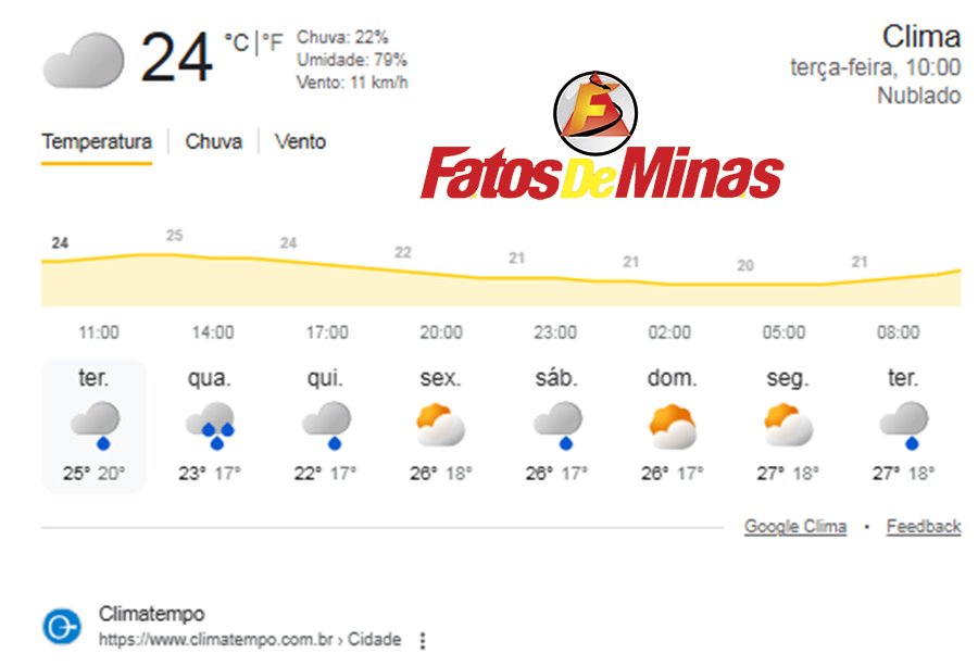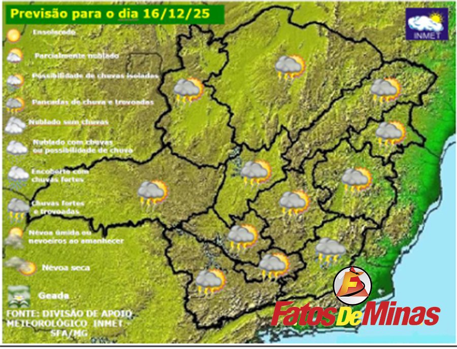 Céu parcialmente nublado a nublado com pancadas de chuva e trovoadas isoladas no Noroeste, Central Mineira, Triângulo Mineiro/alto Paranaíba, Oeste, Sul/Sudoeste, Campo das Vertentes, Zona da Mata e Metropolitana. Demais regiões, céu parcialmente nublado com pancadas de chuva e trovoadas isoladas.
