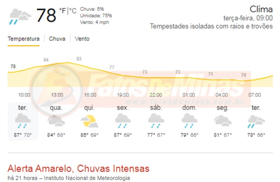MINAS GERAIS – Terça-feira, 19 de março de 2024, as condições meteorológicas são favoráveis ao tempo instável com ocorrência de pancadas de chuva típicas do verão em todas as regiões do estado de Minas Gerais. Tal situação meteorológica se deve especialmente pela combinação do calor e da alta umidade do ar. No decorrer da semana, a tendência é de chuva, por vezes fortes, em grande parte de MG, visto que uma frente fria avançará pelo litoral paulista.