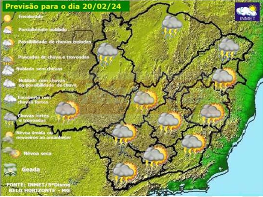 MINAS GERAIS – Terça-feira, 20 de fevereiro de 2024, segue com tempo instável, favorável para chuva em Minas Gerais. A persistência do fluxo de umidade entre as regiões Centro-Oeste e Sudeste mantém as condições favoráveis para o tempo instável, com muitas nuvens e pancadas de chuva, por vezes forte, em todo o estado. As temperaturas máximas seguem fortemente controladas pela nebulosidade, mas a sensação de abafamento persiste. A tendência para a semana é de permanência das instabilidades até pelo menos a próxima sexta-feira (dia 23).