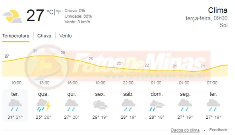 MINAS GERAIS – Nesta terça-feira, a tendência é de redução das chuvas no Norte e Leste de Minas Gerais, devido ao encerramento de atuação da Zona de Convergência do Atlântico Sul. Entretanto, pancadas de chuva decorrentes do aquecimento diurno e disponibilidade de umidade são esperados em quase todas as regiões mineiras, exceto no oeste e sudoeste do estado. Persiste a sensação de abafamento, nas áreas com chuva, devido à grande quantidade de umidade na atmosfera. Obs.: A previsão no site do INMET é resultado direto de modelo numérico de previsão do tempo, portanto pode haver pequenas divergências nas temperaturas previstas divulgadas neste arquivo com os valores do site.