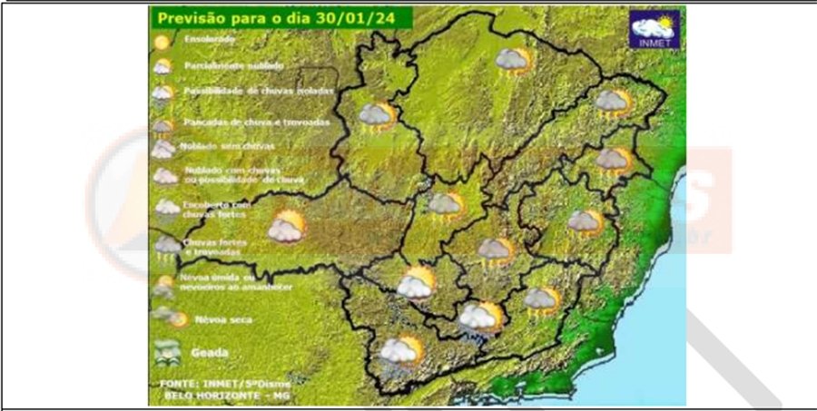 Céu nublado com pancadas de chuva e trovoadas isoladas no Norte, Jequitinhonha, Rio Doce e Mucuri. Céu parcialmente nublado com pancadas de chuva e trovoada isoladas no Noroeste, Central Mineira, Metropolitana e Zona da Mata. Demais regiões, céu claro a parcialmente nublado. Possibilidade de chuva isolada no Sul/Sudoeste.