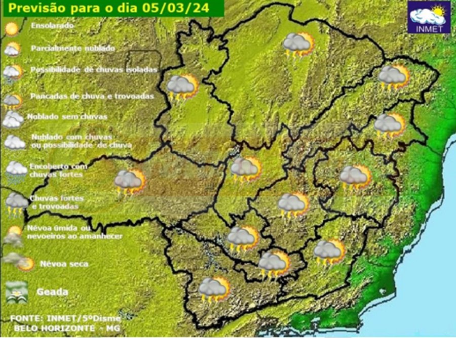 MINAS GERAIS – Nesta terça-feira, 5 de março de 2024, o tempo permanece instável na faixa norte de Minas Gerais, devido à circulação dos ventos e a umidade em médios níveis da atmosfera. Nas demais regiões mineiras, a combinação entre aquecimento diurno e disponibilidade de umidade resulta nas típicas pancadas de verão. As temperaturas permanecem estáveis, assim como, o tempo abafado em todo o estado.