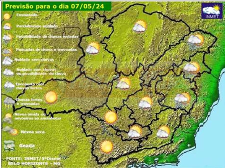 MINAS GERAIS – Nesta terça-feira, dia 7 de maio de 2024, as condições meteorológicas são favoráveis ao tempo estável em Minas Gerais. Todavia, o fluxo de ar carregado de umidade vindo do oceano proporcionará maior cobertura de nuvens e chuva leve sobre parte do Leste do estado, sobretudo, na divisa dos estados de MG e ES.