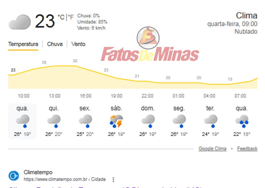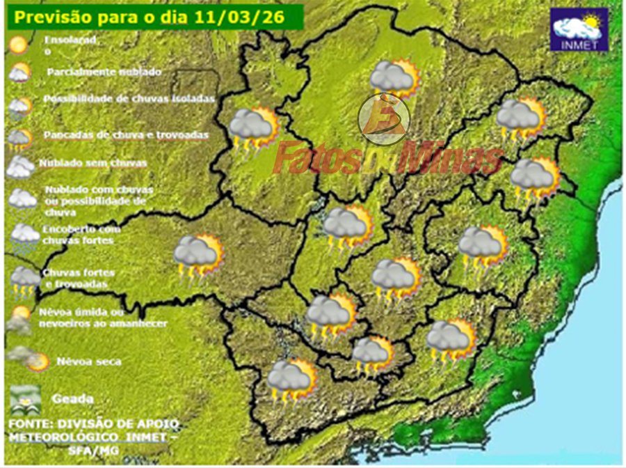 MINAS GERAIS – Quarta-feira, dia 11 de março de 2026, permanece com tempo instável em Minas Gerais. Áreas de instabilidade mantém condições favoráveis para pancadas de chuva, típicas de verão, em todo o estado. Lembrando que estas chuvas apresentam intensidade diferente de uma localidade para outra. Podendo ser mais forte num bairro que em outro, dentro de uma mesma cidade. A tendência é de permanência deste quadro, ou seja, pancadas de chuva a partir da tarde, até pelo menos a sexta-feira.