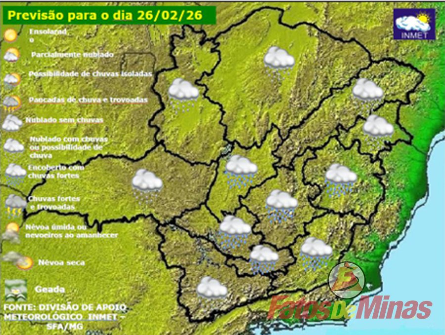 MINAS GERAIS – Quinta-feira, dia 26 de fevereiro de 2026, será mais um dia de chuva em Minas Gerais. As condições atmosféricas continuam favoráveis para o tempo nublado com chuva a qualquer hora em todo o estado. A área de baixa pressão persiste no litoral da Região Sudeste, mantendo o canal de umidade entre a Amazônia e as Regiões Centro-Oeste e Sudeste. Embora, a situação seja semelhante à da Zona de Convergência do Atlântico Sul (ZCAS), visto a persistência de chuva por dias consecutivos, a circulação dos ventos e a disponibilidade de umidade favorece a ocorrência de chuva em todas as regiões do país, portanto não há como definir uma área preferencial como ocorre em condição de ZCAS.