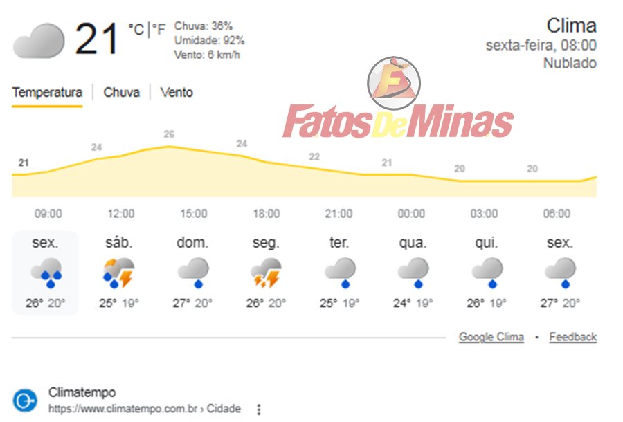 Céu nublado com pancadas de chuva e trovoadas isoladas no Noroeste, Central Mineira, Triângulo Mineiro/Alto Paranaíba, Oeste, Sul/Sudoeste e Campo das Vertentes, Zona da Mata, Metropolitana e Rio Doce. Demais regiões, céu parcialmente nublado com pancadas de chuva e trovoadas isoladas.