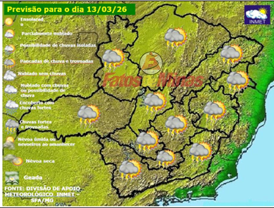 MINAS GERAIS – Nesta sexta-feira, dia 13 de março de 2026, persistem condições favoráveis para a ocorrência das típicas pancadas de verão em Minas Gerais. No decorrer do dia, a formação de uma área de baixa pressão nas imediações do litoral da Região Sudeste mantém o tempo instável no decorrer do fim de semana. A tendência é de maior nebulosidade, principalmente no centro-sul mineiro, contudo, as chuvas permanecem ocorrendo em forma de pancadas isoladas.
