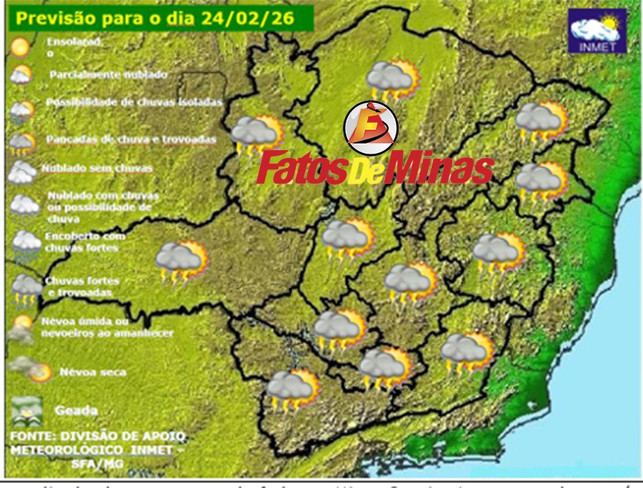 MINAS GERAIS – Terça-feira, dia 24 de fevereiro de 2026, será mais um dia de chuva e tempo abafado em Minas Gerais. A presença de uma área de baixa pressão (cavado) no litoral da Região Sudeste, mantém um canal de umidade entre a Região Amazônica e o Brasil Central e Sudeste favorecendo a manutenção das instabilidades sobre esta grande área do país, incluindo Minas Gerais. Por isto, o dia será de muita nebulosidade, momentos de mormaço e/ou abertura de sol e condições favoráveis para pancadas de chuva a qualquer hora. Esta situação tende a persistir até a próxima sexta-feira (27/02/2026).