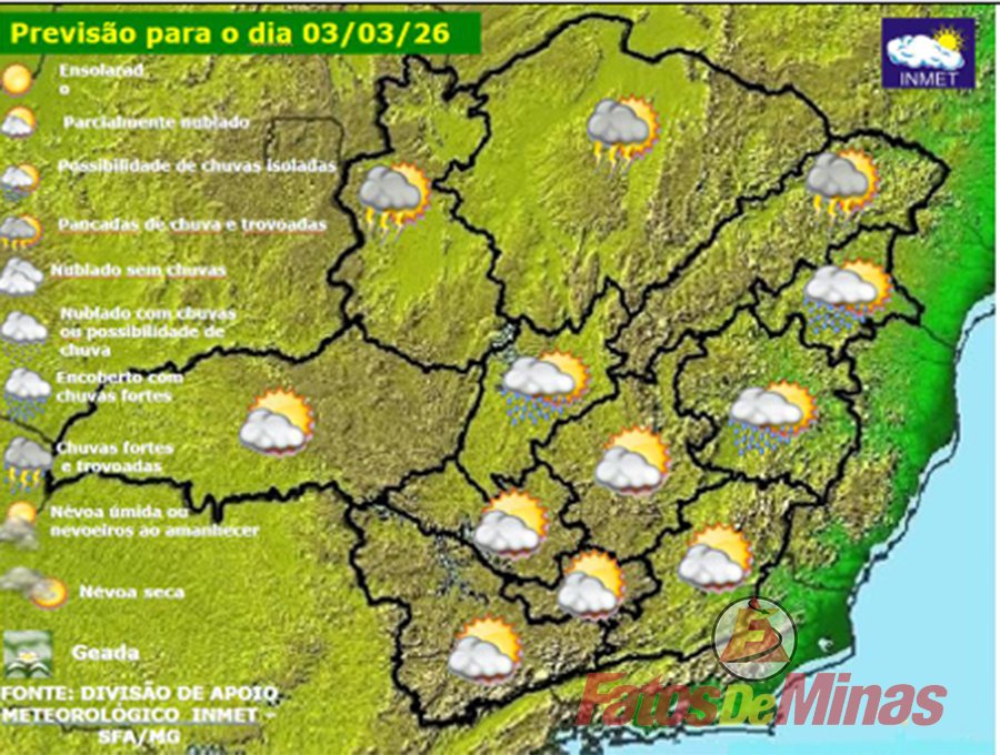 MINAS GERAIS – Terça-feira, dia 3 de março de 2026, com instabilidades restritas à faixa norte de Minas Gerais. As instabilidades que atuam sobre a Bahia influenciam as condições de tempo na faixa norte mineira, onde ainda podem ocorrer pancadas de chuva e trovoadas isoladas. No restante do estado, variação de nebulosidade. Há uma pequena chance de chuva isolada no leste do estado e na Central Mineira. Nas demais regiões, apenas variação de nebulosidade até pelo menos quinta-feira. O céu claro ao amanhecer favorece temperaturas mais amenas no início do dia, no centro-sul e oeste do estado até da semana.