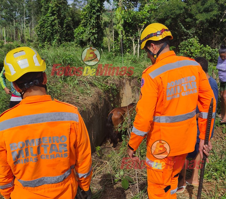 ITABIRA (MG) – Um cavalo foi resgatado pelo Corpo de Bombeiros após cair em uma bacia de contenção de água na manhã desta quinta-feira, dia 12 de março de 2026, na avenida Mandragora, bairro Balsamo. O animal ficou preso dentro da estrutura de concreto, com cerca de 1,80 metro de altura, e não conseguia sair sozinho.