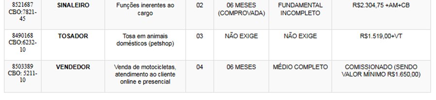 Os interessados nas vagas devem comparecer munidos de DOCUMENTOS e CTPS no SINE – Itabira, av. das Rosas, 410, bairro São Pedro. Telefones: (31) 3839-2140/ 3839-2502/ 3839-2527/ 3839-2861/ 3839-2146.