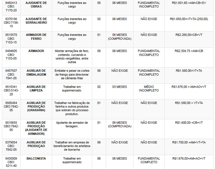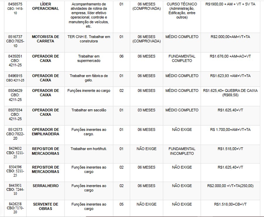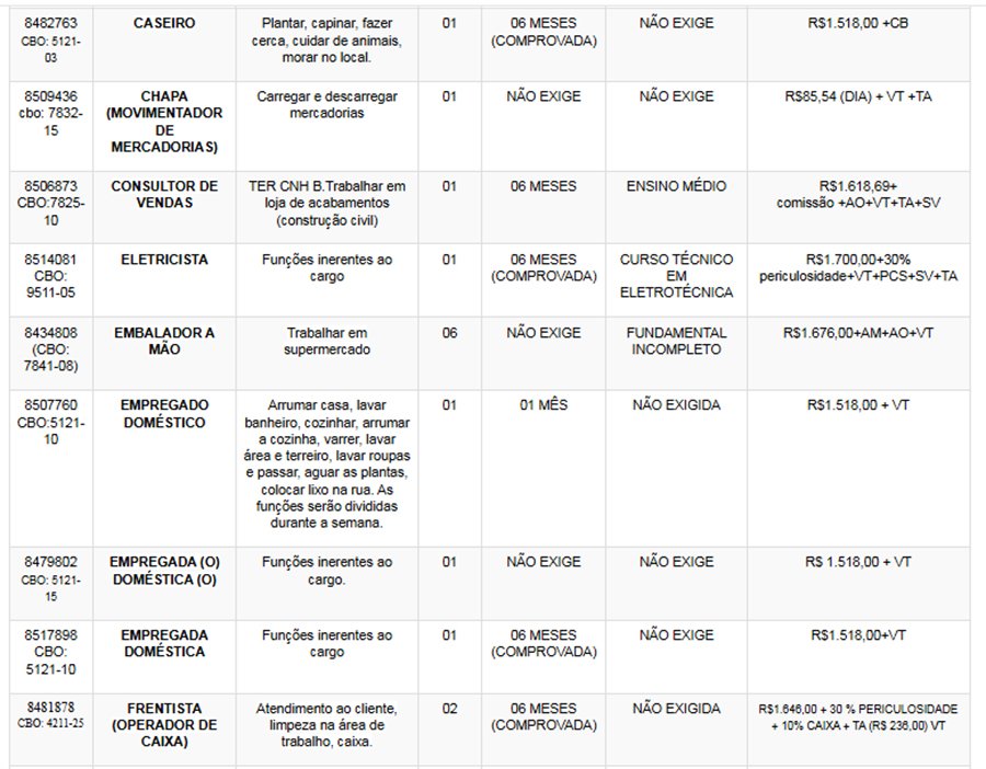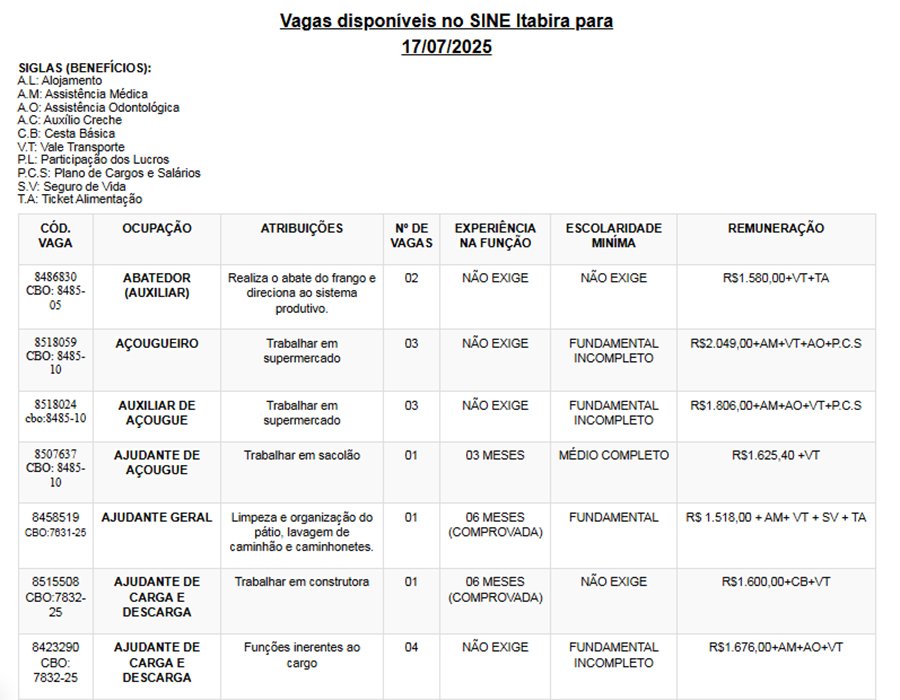 Os interessados nas vagas devem comparecer munidos de DOCUMENTOS e CTPS no SINE – Itabira, av. das Rosas, 410, bairro São Pedro. Telefones: (31) 3839-2140/ 3839-2502/ 3839-2527/ 3839-2861/ 3839-2146.