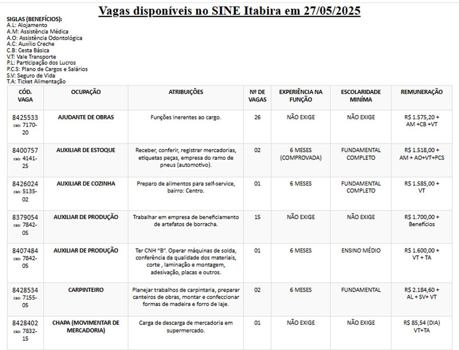 SINE ITABIRA Confira 119 vagas de emprego ofertadas pelo Sine Itabira nesta terça-feira, 27 de maio