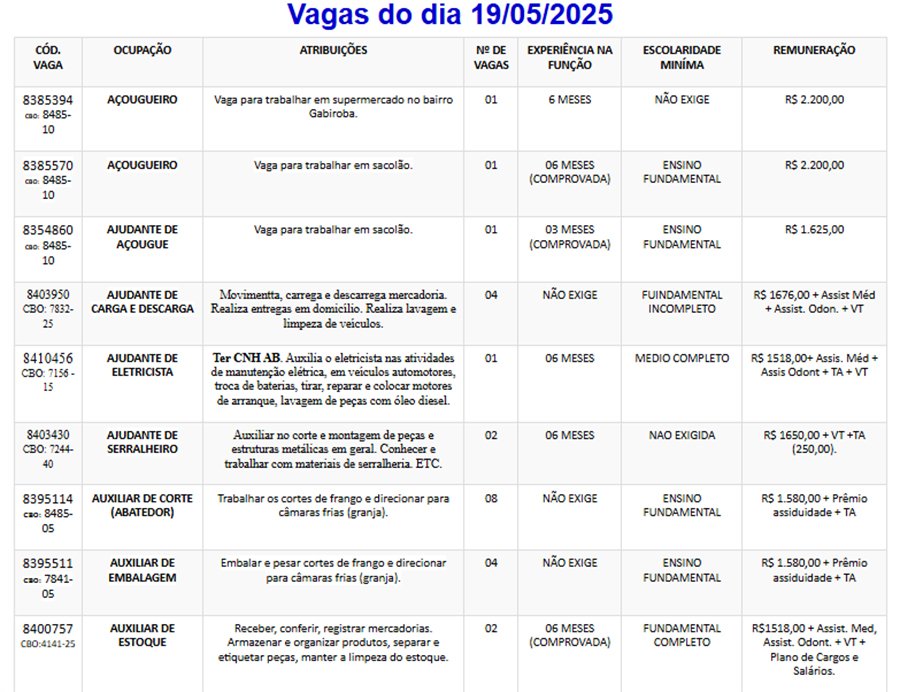 SINE ITABIRA Confira 142 vagas de emprego ofertadas pelo Sine Itabira nesta segunda-feira, 19 de maio
