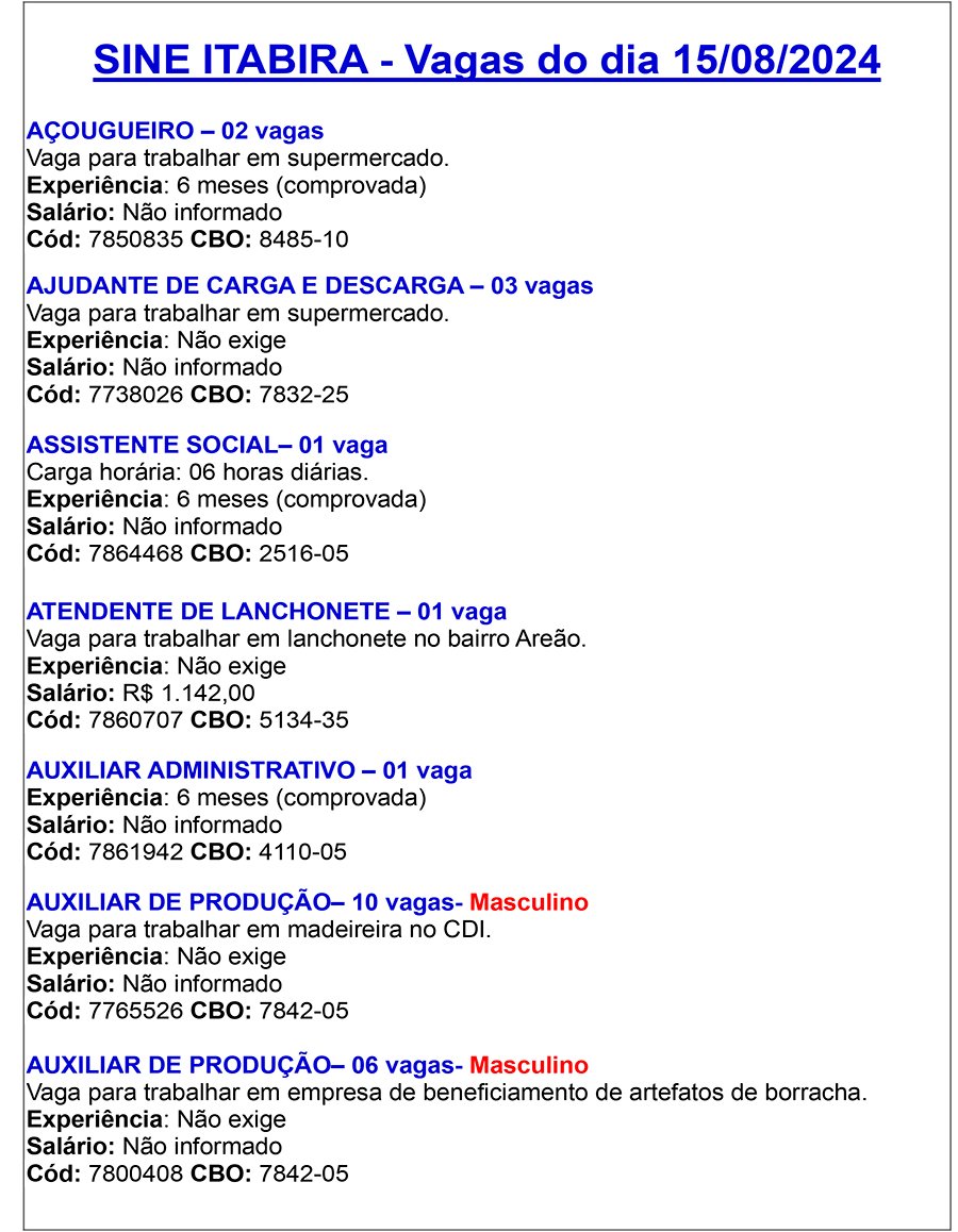 SINE ITABIRA Confira 166 vagas de emprego ofertadas pelo Sine Itabira nesta quinta-feira, 15 de agosto