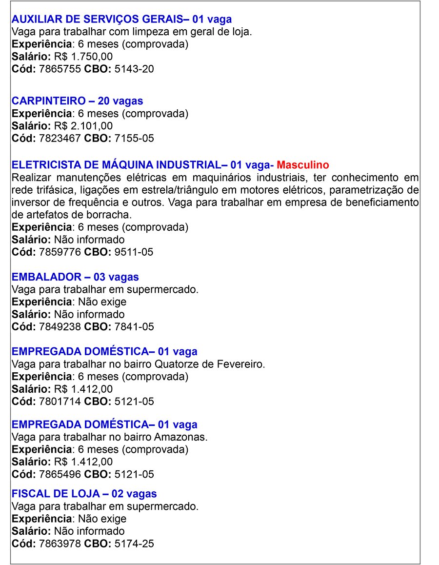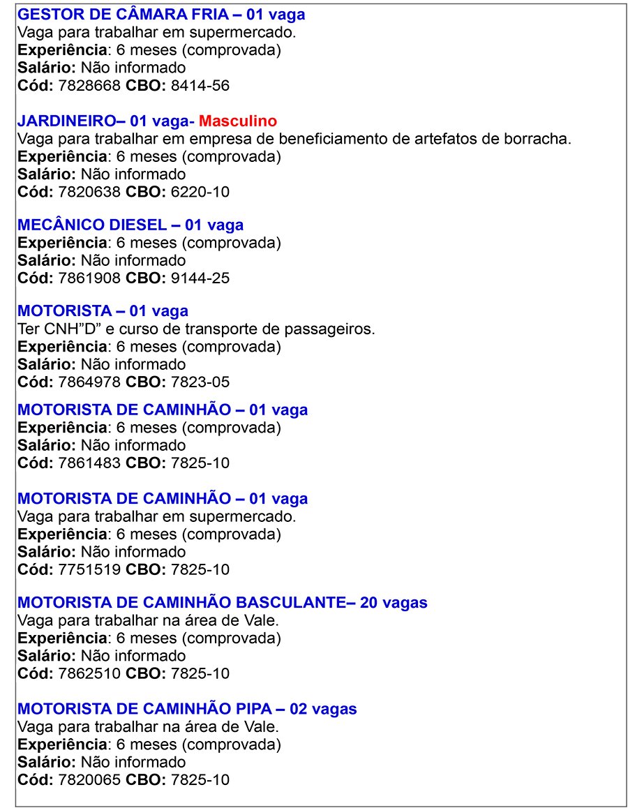 Os interessados nas vagas devem comparecer munidos de DOCUMENTOS e CTPS no SINE – Itabira, av. das Rosas, 410, bairro São Pedro. Telefone: (31) 3839-2141/ 3839-2502/ 3839-2527/ 3831-5188/ 3839-2861/ 3839-2152/ 3839-2138.
