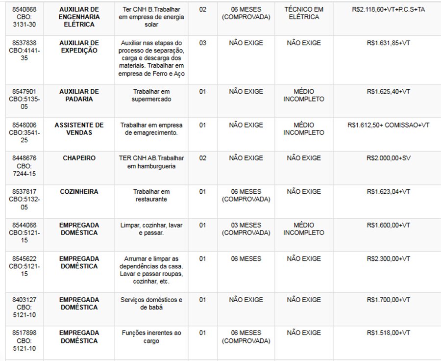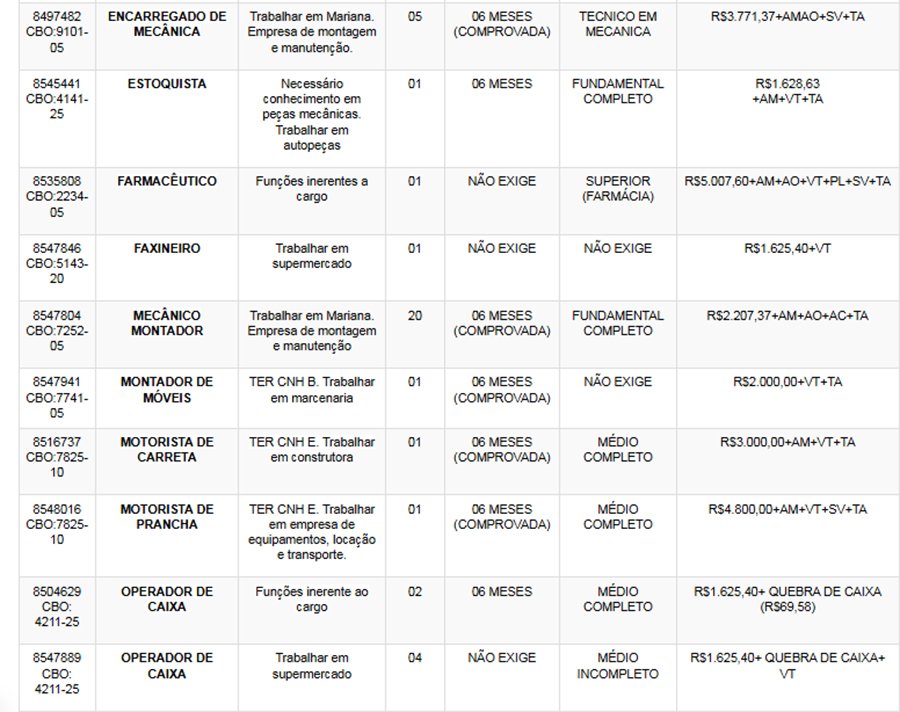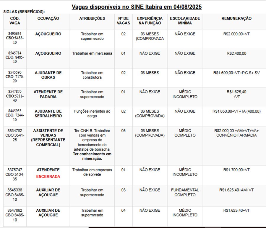 Os interessados nas vagas devem comparecer munidos de DOCUMENTOS e CTPS no SINE – Itabira, av. das Rosas, 410, bairro São Pedro. Telefones: (31) 3839-2140/ 3839-2502/ 3839-2527/ 3839-2861/ 3839-2146.