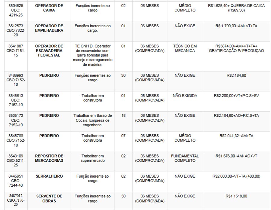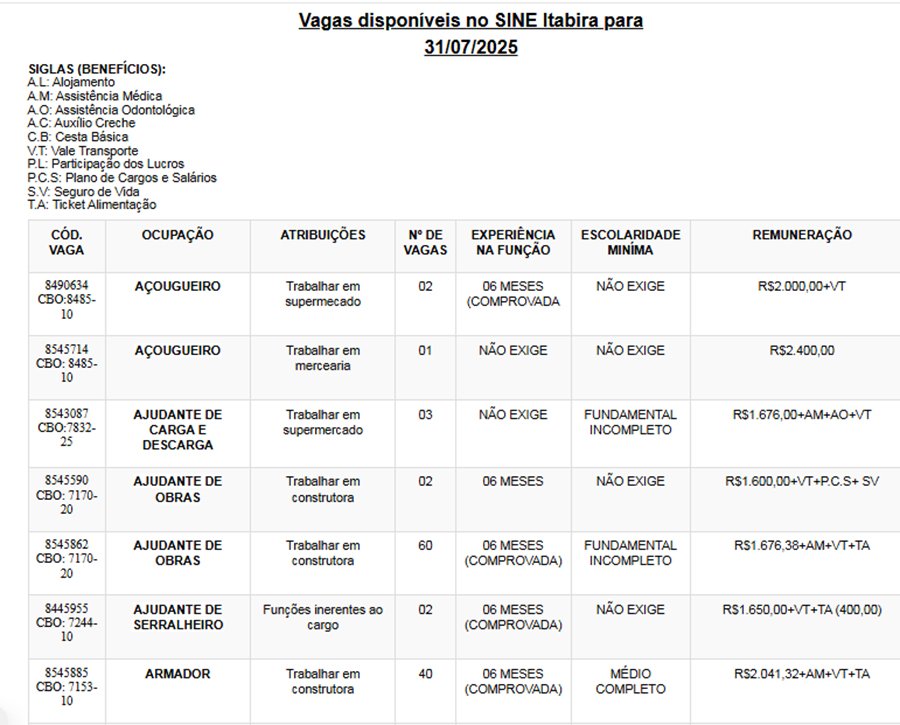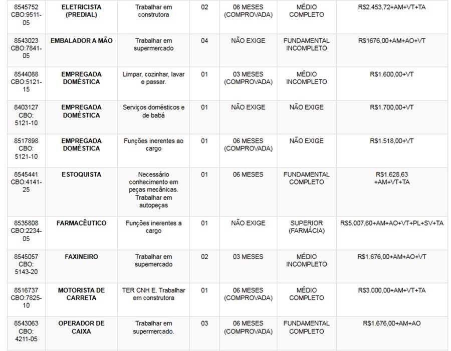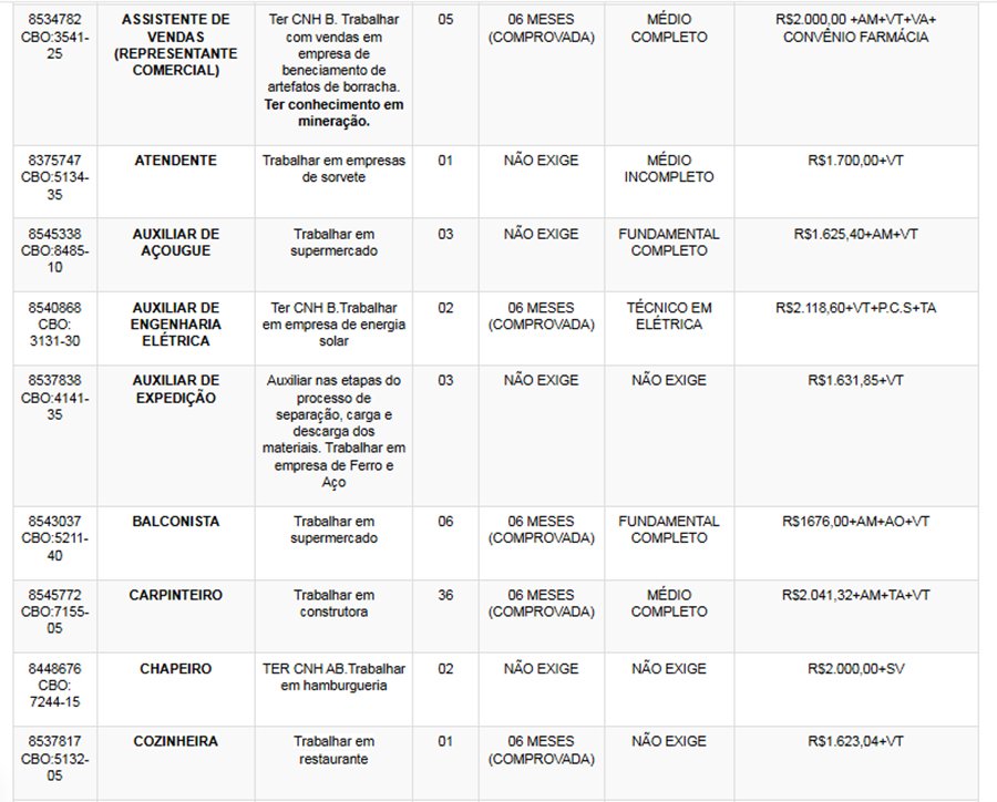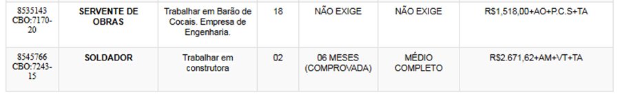 Os interessados nas vagas devem comparecer munidos de DOCUMENTOS e CTPS no SINE – Itabira, av. das Rosas, 410, bairro São Pedro. Telefones: (31) 3839-2140/ 3839-2502/ 3839-2527/ 3839-2861/ 3839-2146.