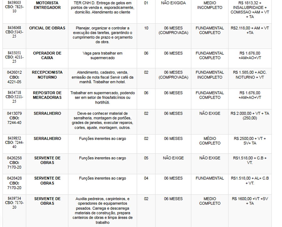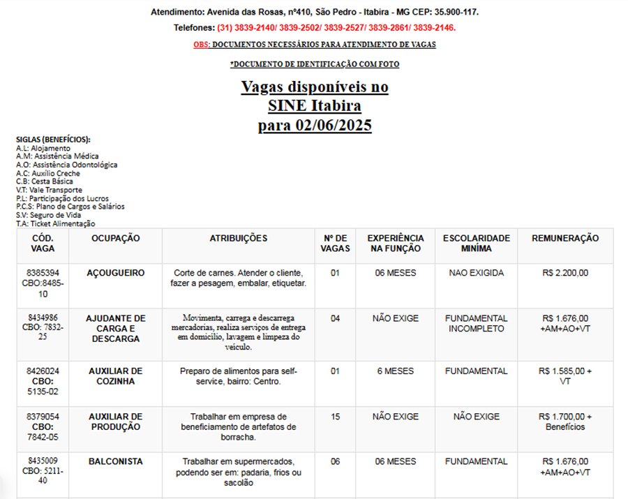 Os interessados nas vagas devem comparecer munidos de DOCUMENTOS e CTPS no SINE – Itabira, av. das Rosas, 410, bairro São Pedro. Telefone: (31) 3839-2141/ 3839-2502/ 3839-2527/ 3831-5188/ 3839-2861/ 3839-2152/ 3839-2138.