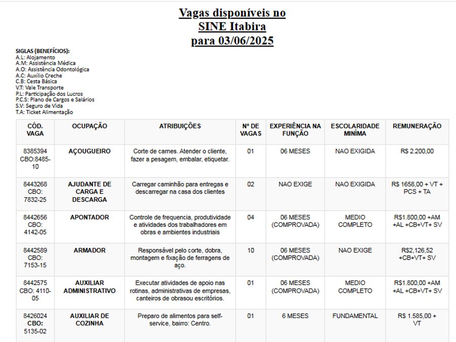 SINE ITABIRA Confira as vagas de emprego ofertadas pelo Sine Itabira nesta terça-feira, 3 de junho