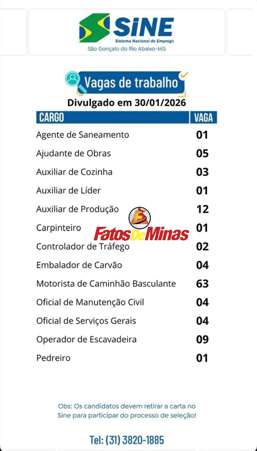 SINE SÃO GONÇALO Confira 110 vagas de emprego do Sine de São Gonçalo do Rio Abaixo nesta sexta-feira, 30 de janeiro