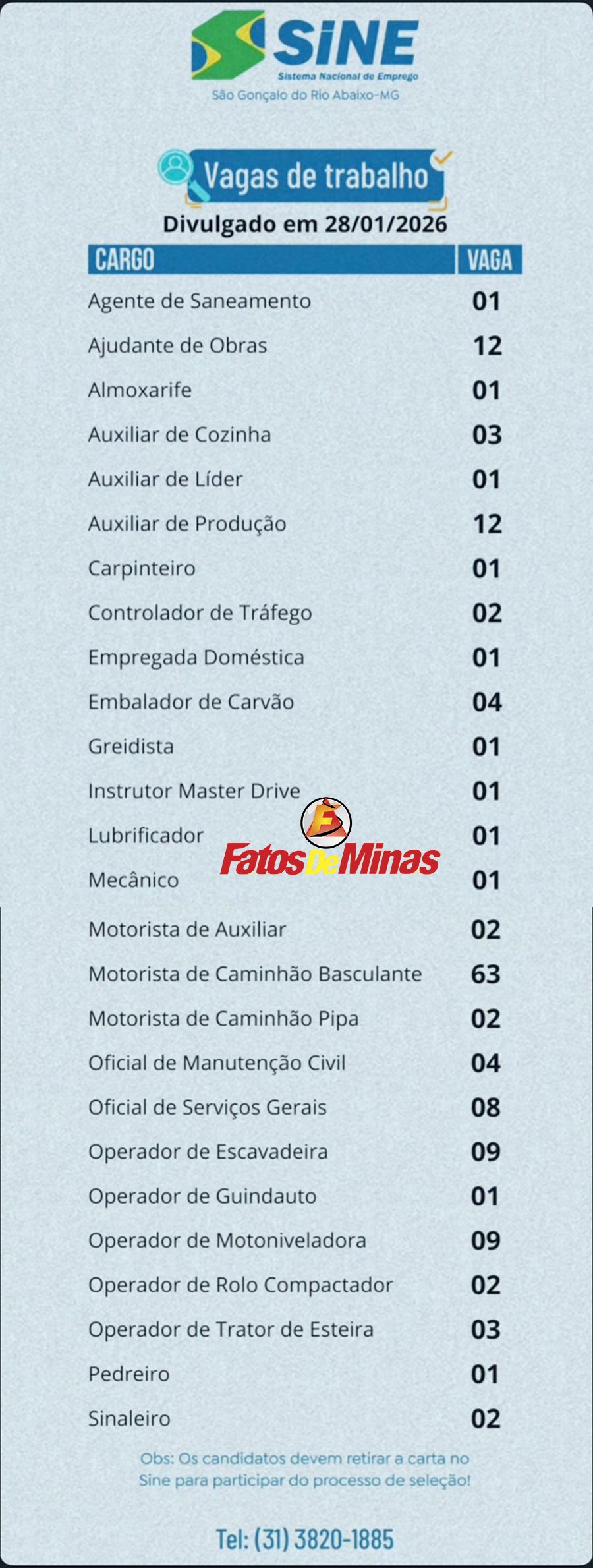 SINE SÃO GONÇALO Confira 148 vagas de emprego do Sine de São Gonçalo do Rio Abaixo nesta quarta-feira, 28 de janeiro
