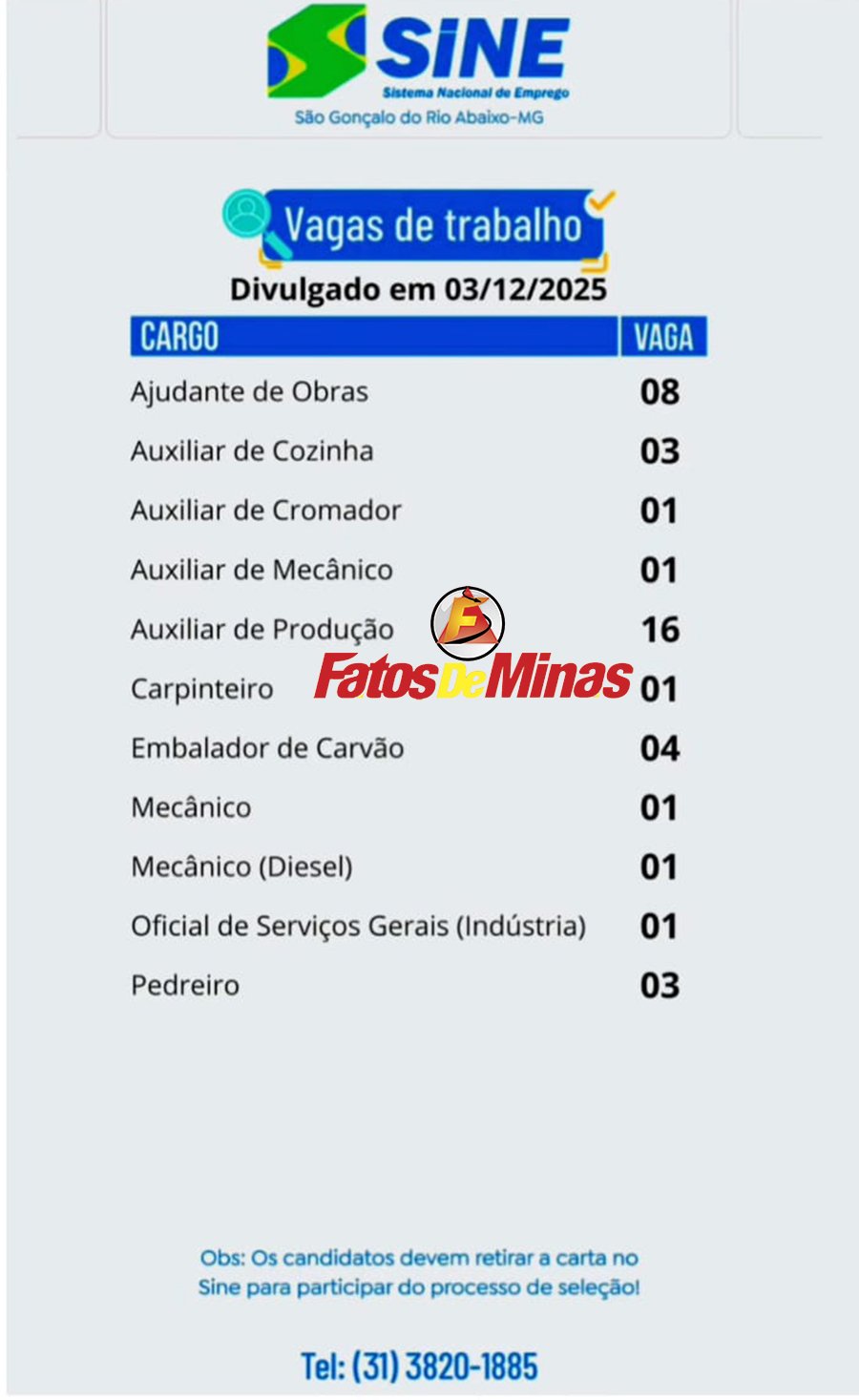 SINE SÃO GONÇALO Confira 40 vagas de emprego do Sine de São Gonçalo do Rio Abaixo nesta quarta-feira, 3 de dezembro