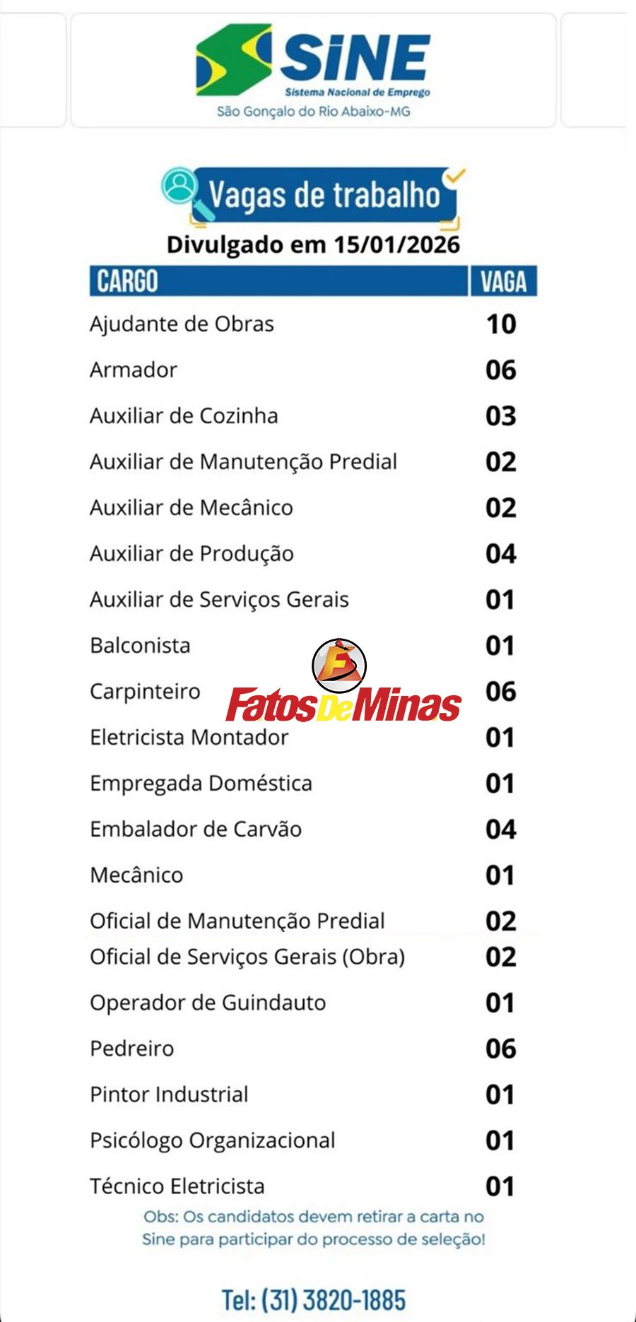 SINE SÃO GONÇALO Confira 46 vagas de emprego do Sine de São Gonçalo do Rio Abaixo nesta quinta-feira, 15 de janeiro
