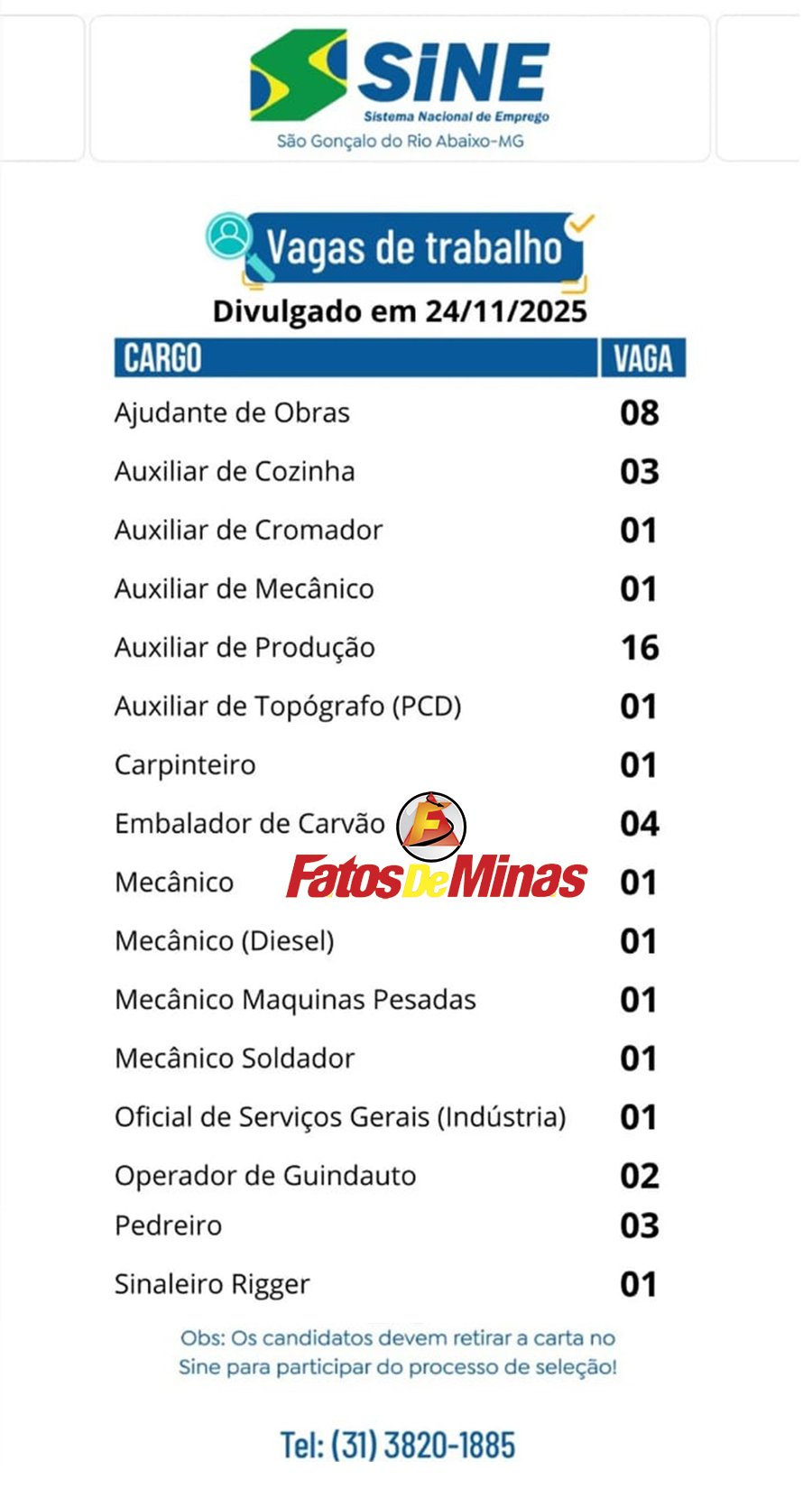 SINE SÃO GONÇALO Confira 47 vagas de emprego do Sine de São Gonçalo do Rio Abaixo nesta terça-feira, 25 de novembro