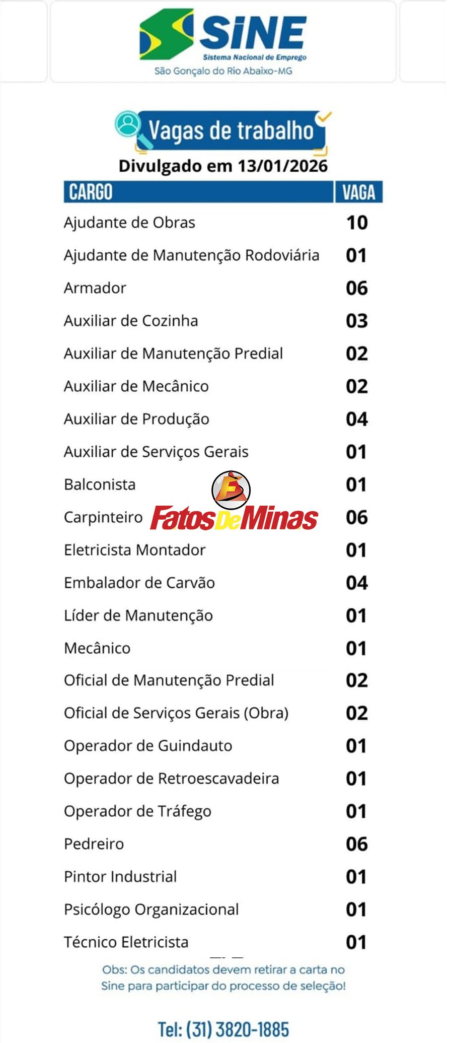 SINE SÃO GONÇALO Confira 59 vagas de emprego do Sine de São Gonçalo do Rio Abaixo nesta terça-feira, 13 de janeiro