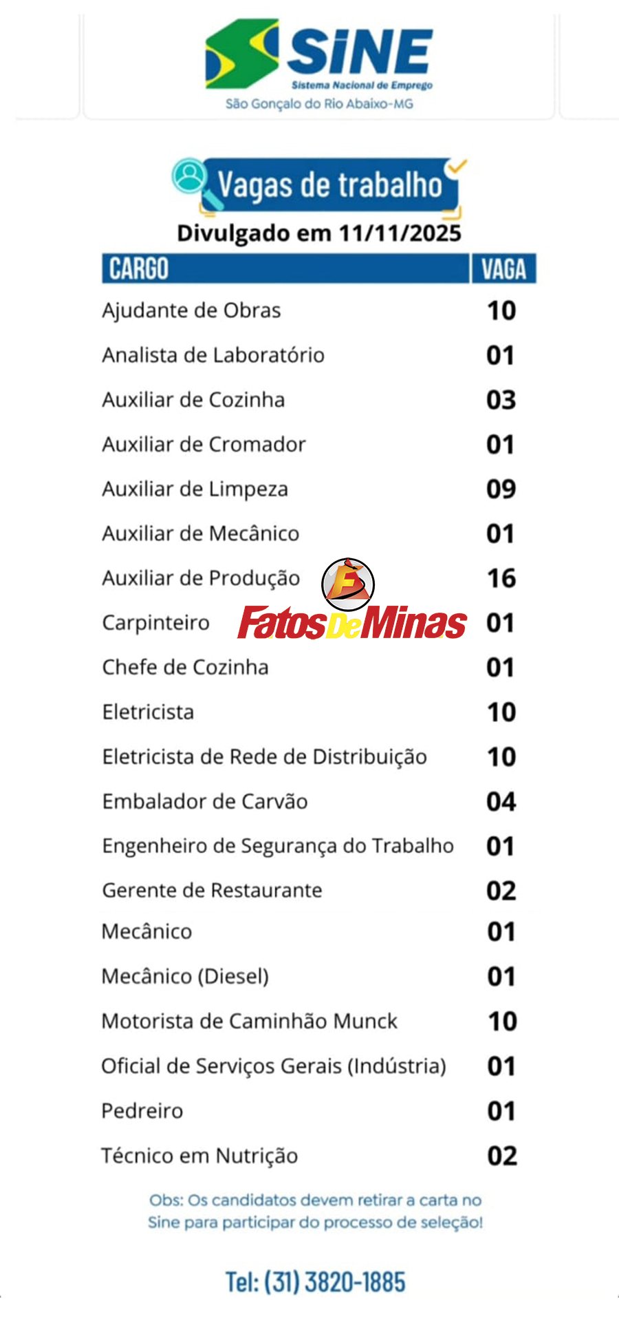SINE SÃO GONÇALO Confira 86 vagas de emprego do Sine de São Gonçalo do Rio Abaixo nesta terça-feira, 11 de novembro
