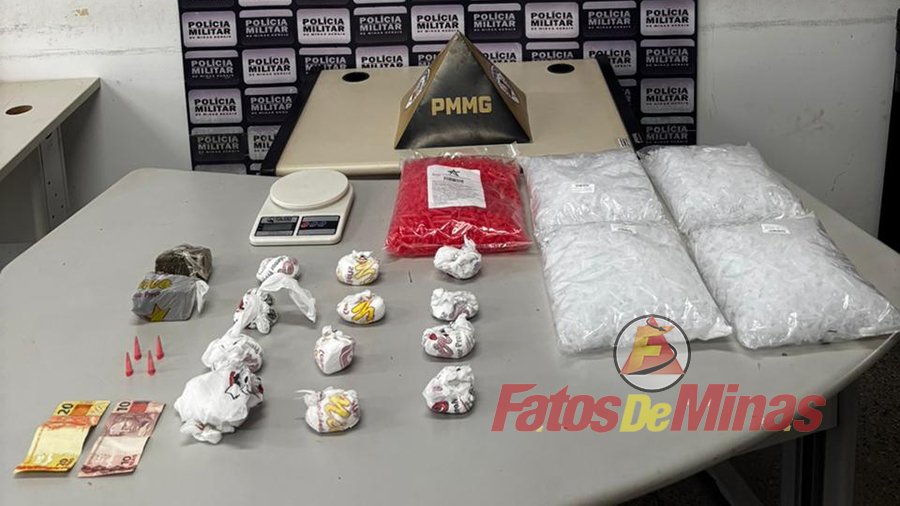Entre os materiais apreendidos estão dois tabletes médios de maconha, 12 porções médias e quatro pinos de cocaína, uma balança de precisão, cinco embalagens de microtubos vazios utilizados para fracionamento de drogas e R$ 30 em dinheiro.