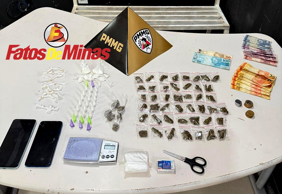 Com autorização, os militares realizaram buscas no quarto do suspeito, onde foram encontradas porções de crack, cocaína e maconha, além de dinheiro em espécie e materiais utilizados no preparo e na comercialização de drogas.